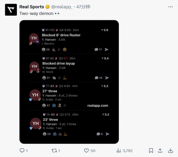 美頂流數(shù)據(jù)網(wǎng)站曬楊瀚森表現(xiàn):攻防兩端的怪獸!
