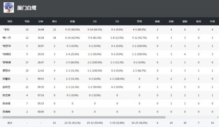 球隊方面,全隊整體在進攻端依然很拼,共有9次搶斷;兩分球32中19,命中率高達59.4%。球員方面,李彤半場就得到12分,全場砍下全隊最高的22分,另有6籃板;賴一丹雖然罰球丟了不少,但最后兩罰頂住壓力,全場貢獻18分3籃板3搶斷;另外羅曉倩、廖麗華等人也都為勝利做出自己的貢獻。