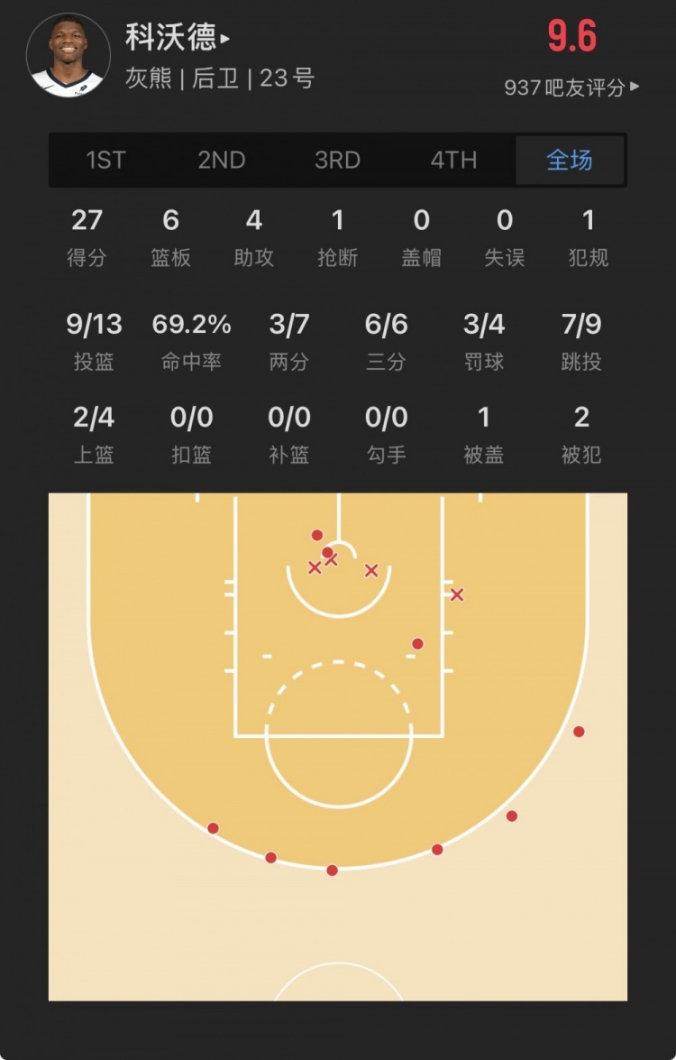 灰熊11號(hào)秀 錫德里克-科沃德 登場(chǎng)23.7分鐘