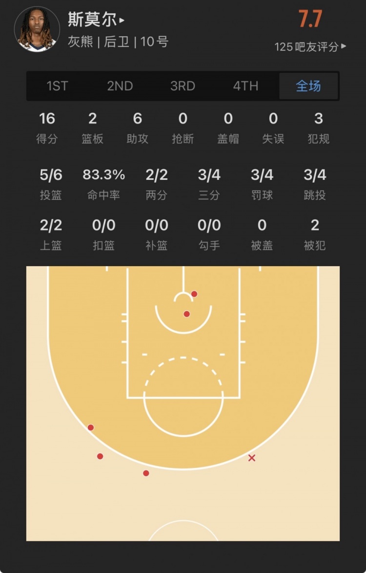 灰熊48號(hào)秀 賈馮-斯莫爾 登場(chǎng)20.8分鐘