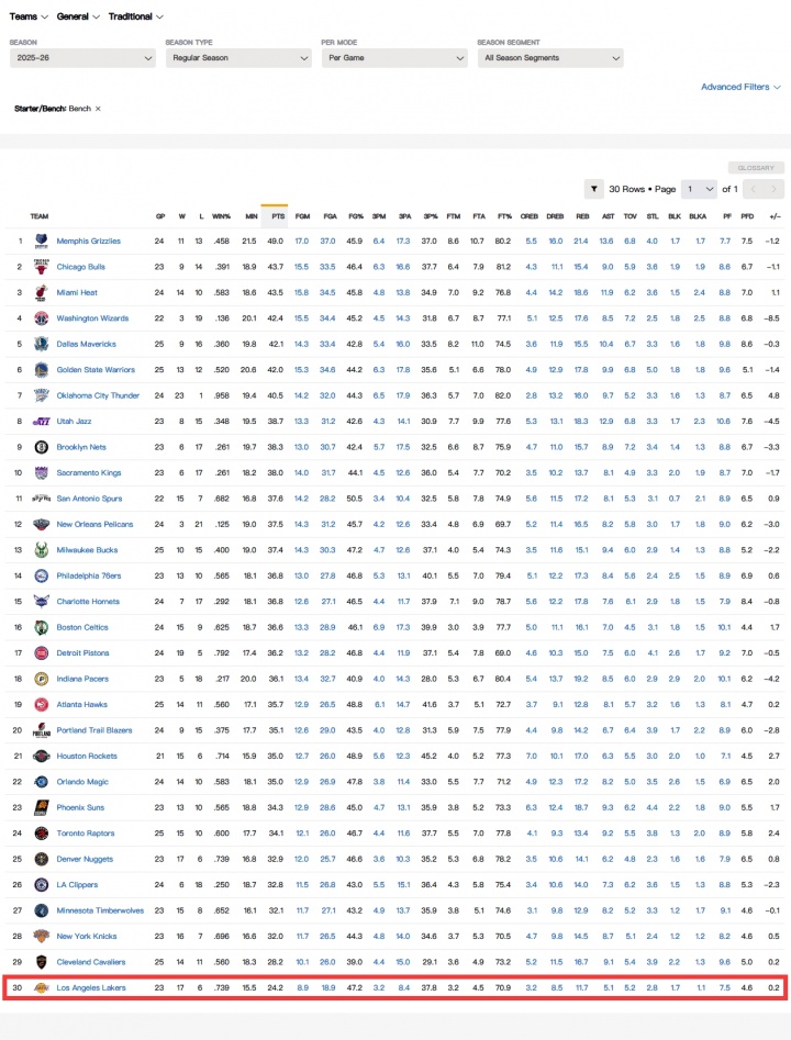賽季至今,湖人替補(bǔ)場(chǎng)均只能得到24.2分,排在全聯(lián)盟倒數(shù)第一位。