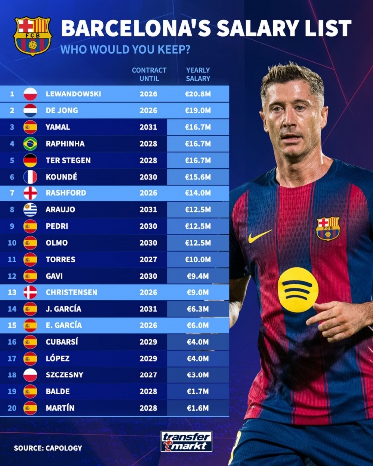10月10日訊 德國轉會市場列出了巴薩球員年薪排名,萊萬2080萬歐居首,德容1900萬歐次席。