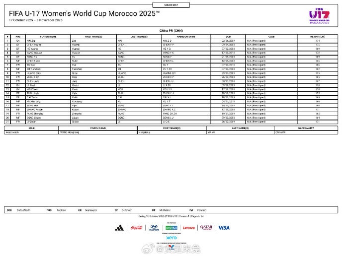 10月11日訊 中國U17女足的U17女足世界杯報(bào)名名單公布,共21名球員入選。中國U17女足報(bào)名名單如下:門將:牛子琪、 ????李欣芝、尤雅欣后衛(wèi):陳鈺熒、何遠(yuǎn)琦、楊雨萱、周雅潔、蔡鑫林、中場:宋語、陳睿琳、徐悅、俞天楨、徐曉棠、宋利娟、李啟嫻前鋒:黃沁怡、周欣怡、陳俊吉、曾屹婕、張克璨、方珍珠 ????