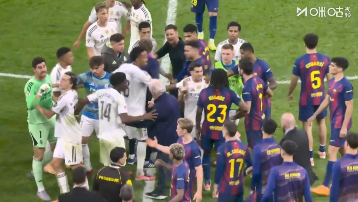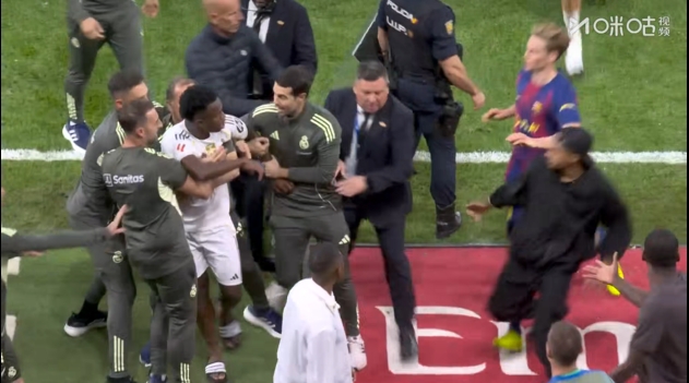 10月27日訊 國家德比賽后爆發(fā)第二次沖突,兩隊(duì)混戰(zhàn)!維尼修斯沖亞馬爾連續(xù)做“閉嘴”手勢,想動(dòng)粗工作人員死命拉?。?/p>
