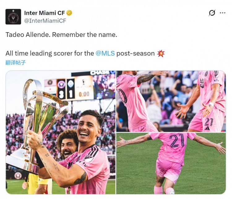 邁阿密國際社媒曬出阿連德捧杯的照片,配文:“阿連德——記住這個名字,美職聯(lián)歷史(單屆)季后賽射手王?!?/p>