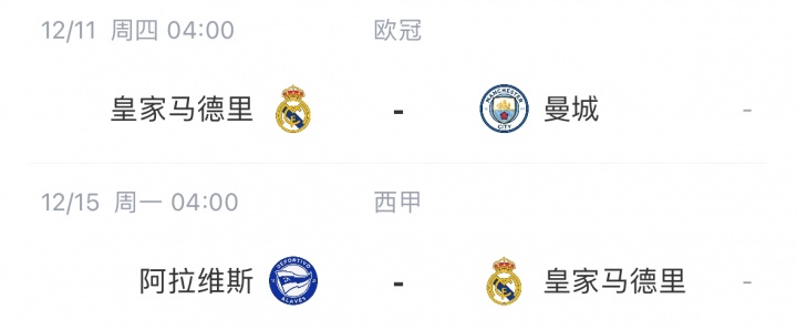 皇馬將于本周中對陣曼城,下周一對陣阿拉維斯。