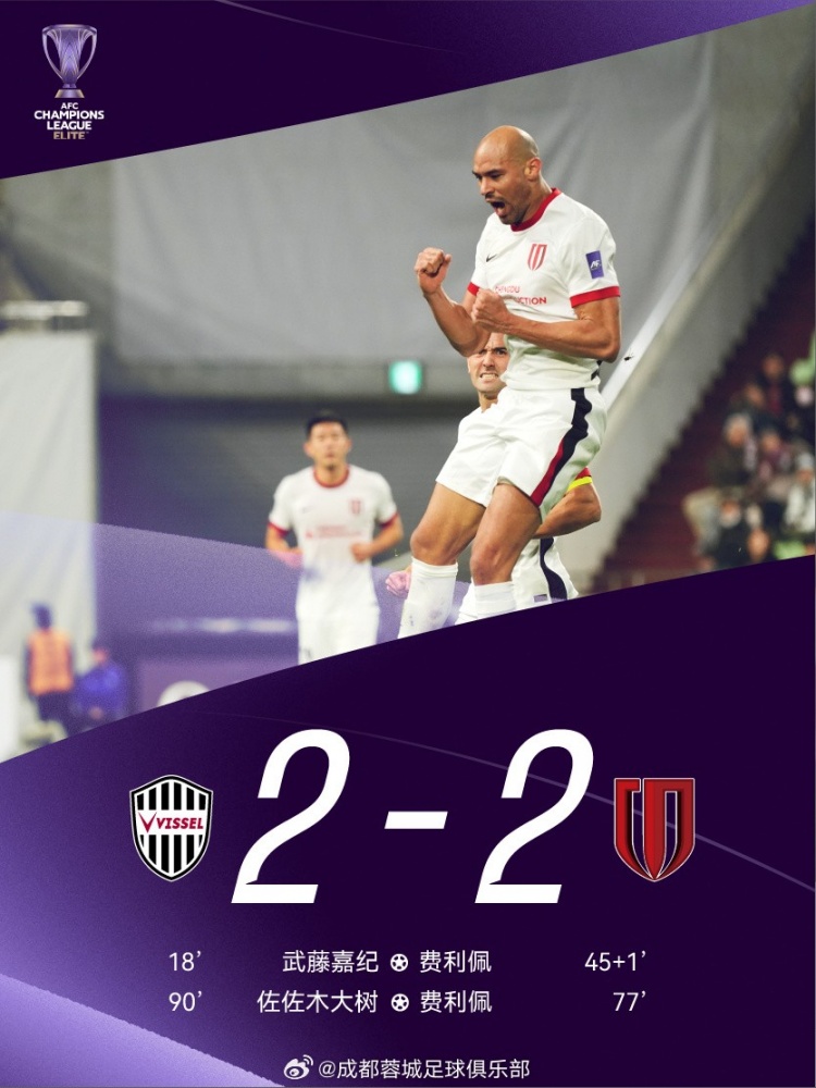 北京時間12月9日18:00,2025/26亞冠精英聯(lián)賽第6輪,成都蓉城客場挑戰(zhàn)亞冠精英聯(lián)賽東亞區(qū)榜首神戶勝利船。開場后,成都蓉城雖在控球率上不占優(yōu),但在射門次數(shù)上高于對手。第12分鐘,周定洋甩頭攻門,可惜皮球擊中門柱彈出。第18分鐘,對手率先破門;補時階段,周定洋在前場搶斷成功,費利佩一記世界波將比分扳平!半場戰(zhàn)罷,比分為1-1。易邊再戰(zhàn),成都蓉城攻勢如潮,韋世豪可惜再次中柱。比賽第75分鐘,韋世豪傳中制造點球,費利佩主罰點球命中,幫助球隊反超比分。臨近終場,對手獲得點球,再度改寫比分。最終,成都蓉城2-2戰(zhàn)平神戶勝利船。