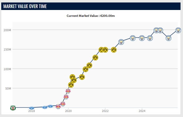 哈蘭德本賽季各項賽事出戰(zhàn)20場,打進20球送出3次助攻。身價也從1.8億漲到2億