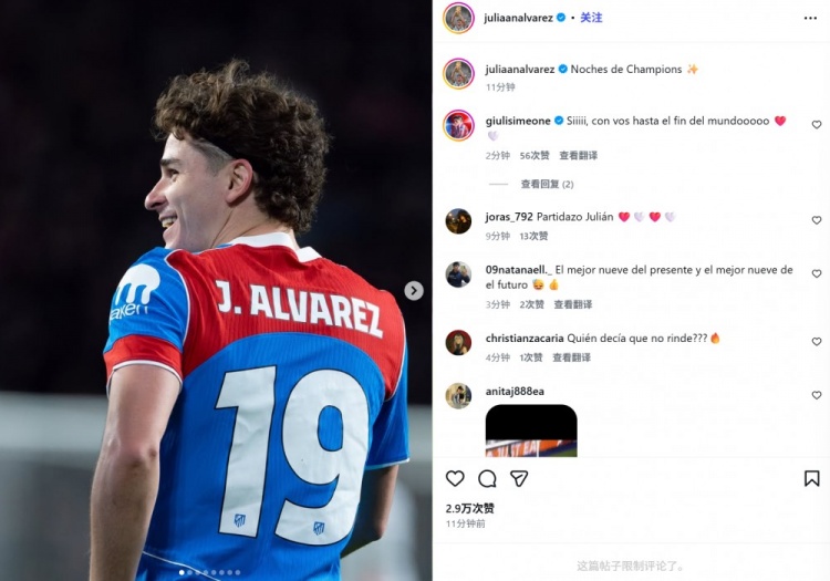 12月10日訊 馬競在本輪歐冠3-2險勝埃因霍溫,阿爾瓦雷斯為球隊扳平比分。比賽第37分鐘,馬競前場斷球,瑟爾洛特面對單刀機會無私橫傳給了位置更好的阿爾瓦雷斯,后者推射空門建功,幫助馬競扳平比分。他也在賽后通過社媒曬出自己的比賽照,并配文:“歐冠之夜!?”