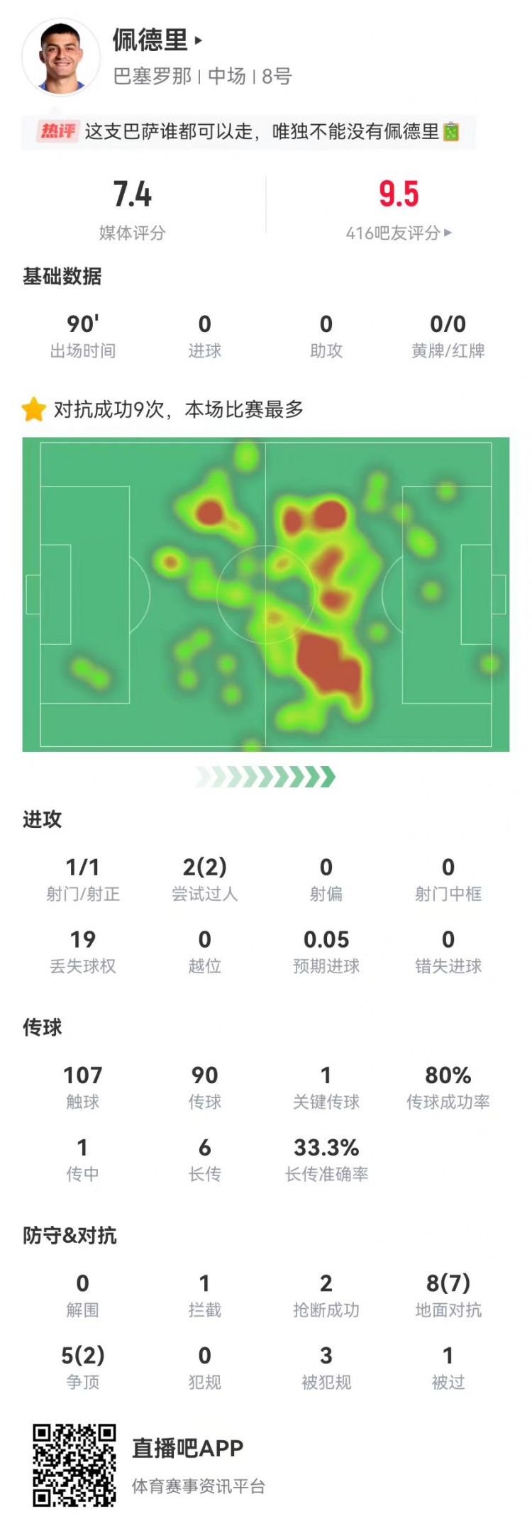 12月10日訊 巴薩在本輪歐冠對(duì)陣法蘭克福,佩德里本場(chǎng)數(shù)據(jù)如下: