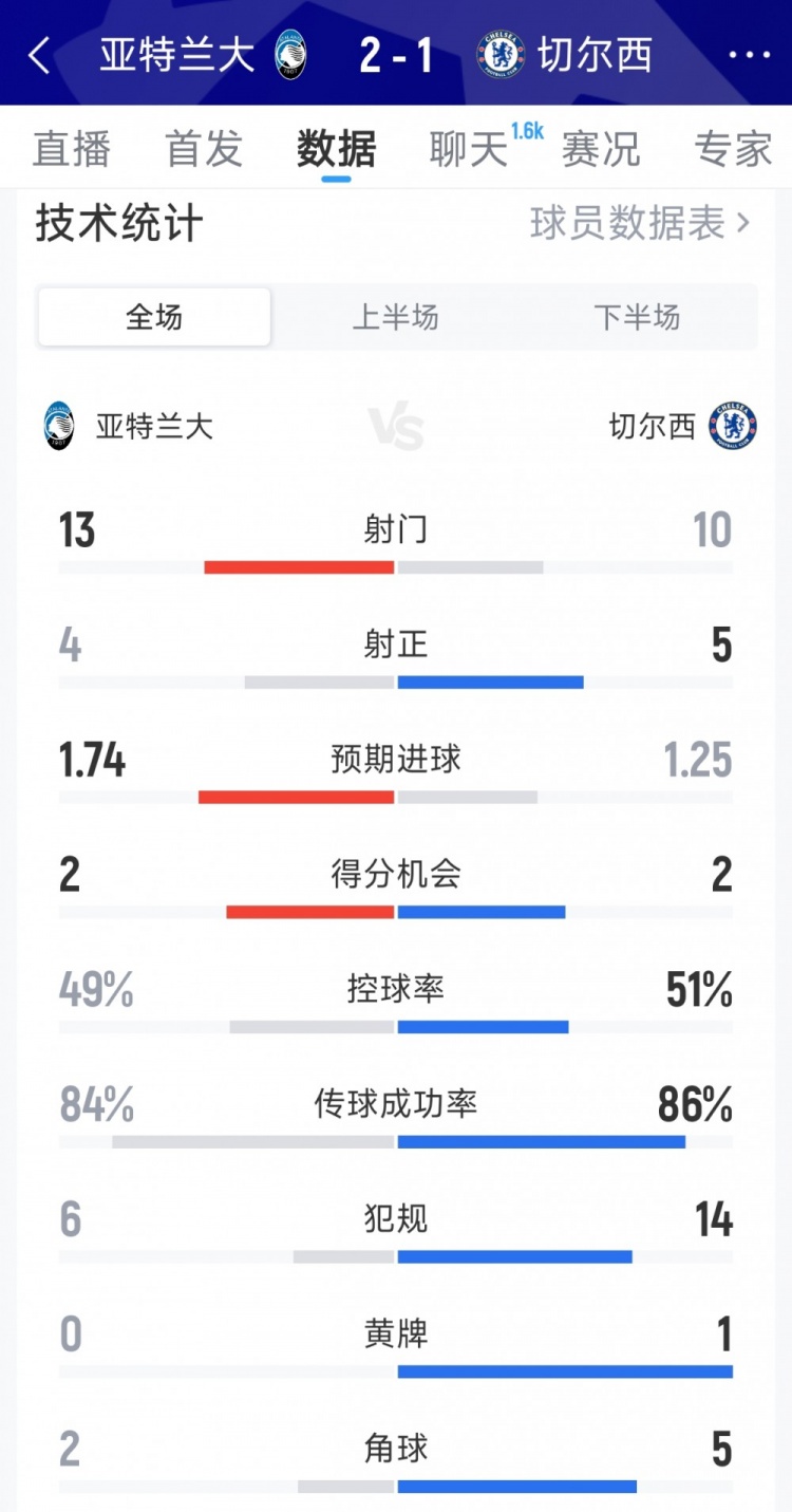 12月10日訊 在本輪歐冠,亞特蘭大2-1擊敗切爾西,以下為雙方全場數(shù)據(jù)對比:亞特蘭大vs切爾西射門:13-10射正:4-5預(yù)期進球:1.74-1.25得分機會:2-2控球率:49%-51%傳球成功率:84%-86%犯規(guī):6-14黃牌:0-1角球:2-5